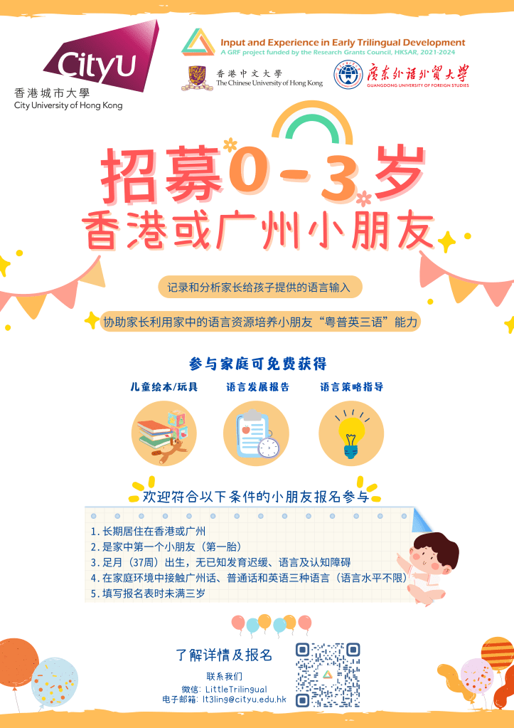 - 研究项目:我们正在为一个由香港政府资助的研究项目招募一批孩子和家长参加我们的研究。这个项目的主要研究对象是香港和广州的普通话、粤语(广州话)和英语的儿童(0到3岁)及其主要照顾者。我们希望为儿童语言发展寻找科学证据,更好地解答家长的问题。